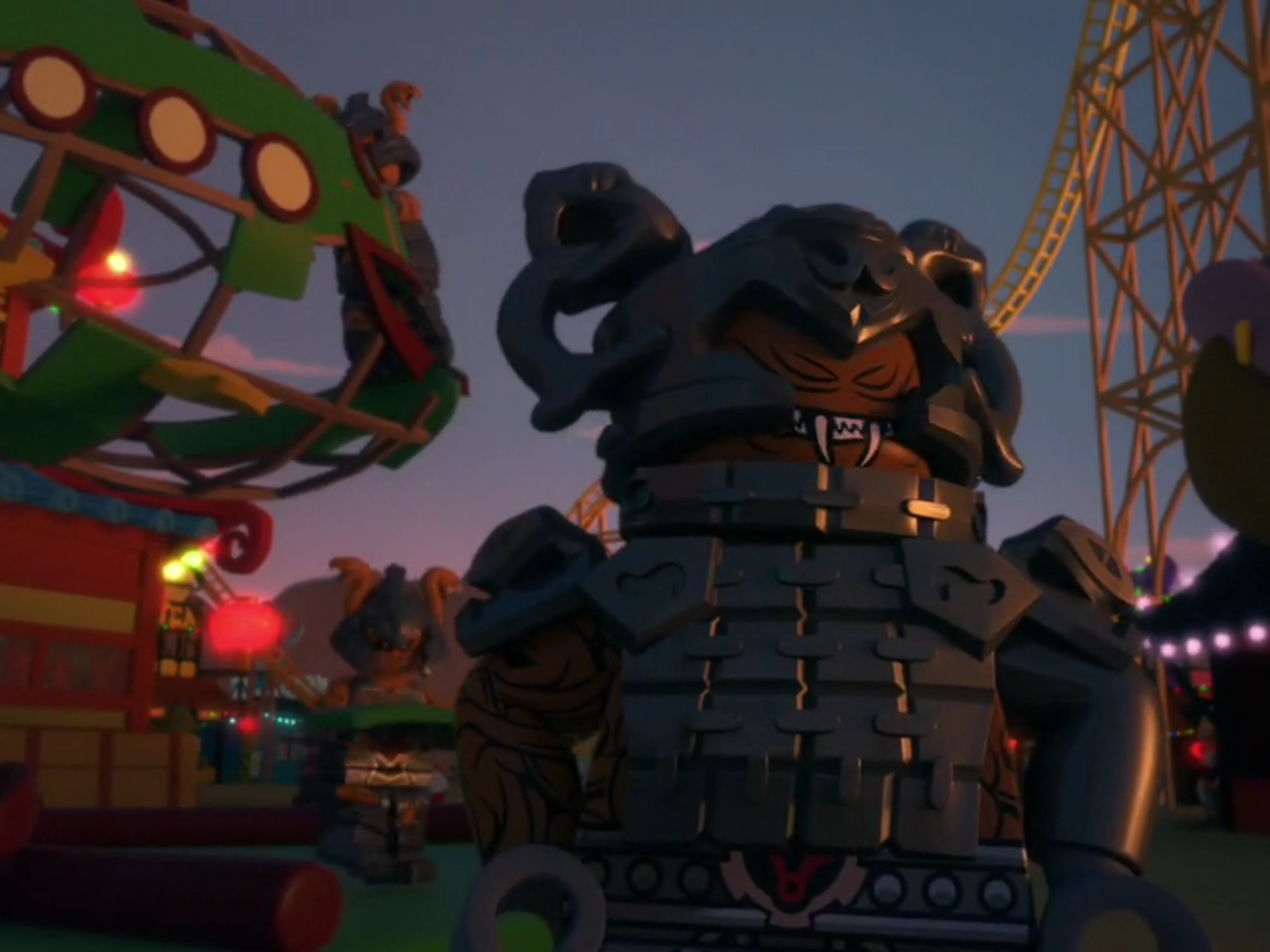 Ниндзя вступают в бой. Джей и Ния защищаются от мощных воинов с секирами на аттракционах американских горках. Они работают по старой тактике (Джей разбивает нунчаками воина, Ния обливает змей водой и Джей перебивает Потомков Великого Поглотителя Молнией), в итоге побеждая всех и даже убив двух важных воин-офицеров с секирами, которые не успели ударить по Ниндзя и единственное, что сделали - отрубили много металлических кусков и выкрали их.