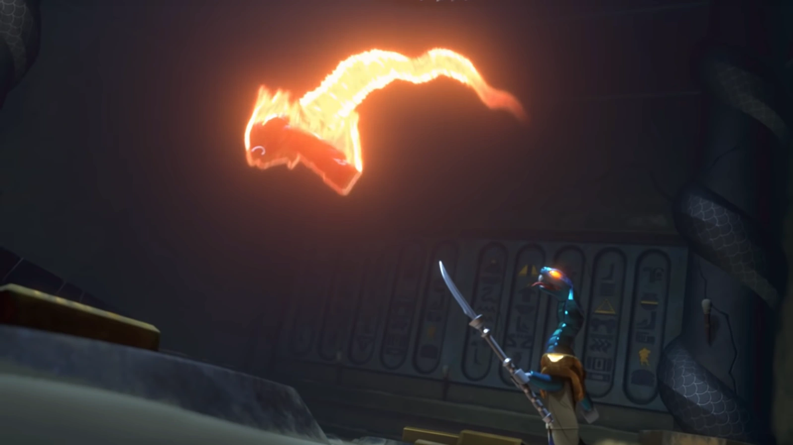 Когда ни делают это, пазл уничтожает Асфира и выползает из своей гробницы. Она в ярости спрашивает Ллойда, где тот, кто заточил её. Она не дожидается окончательного ответа Зелёного Ниндзя и атакует его с помощью Тёмной Магии. Ниндзя встают на боевые позиции и метают в колдунью элементальные заряды, но та отражает удары Глефой. Она сражается со всеми Ниндзя и без труда побеждает их, высасывая после этого силу Кая. Она становится Огненной змеёй, начинает течь магическая магма, которая оживит войско Огненных Змеев. Асфира с помощью магии заковывает Ниндзя и оглушённого Кая в цепи на стене, а сама гонится за Клатчем Пауэрсом.