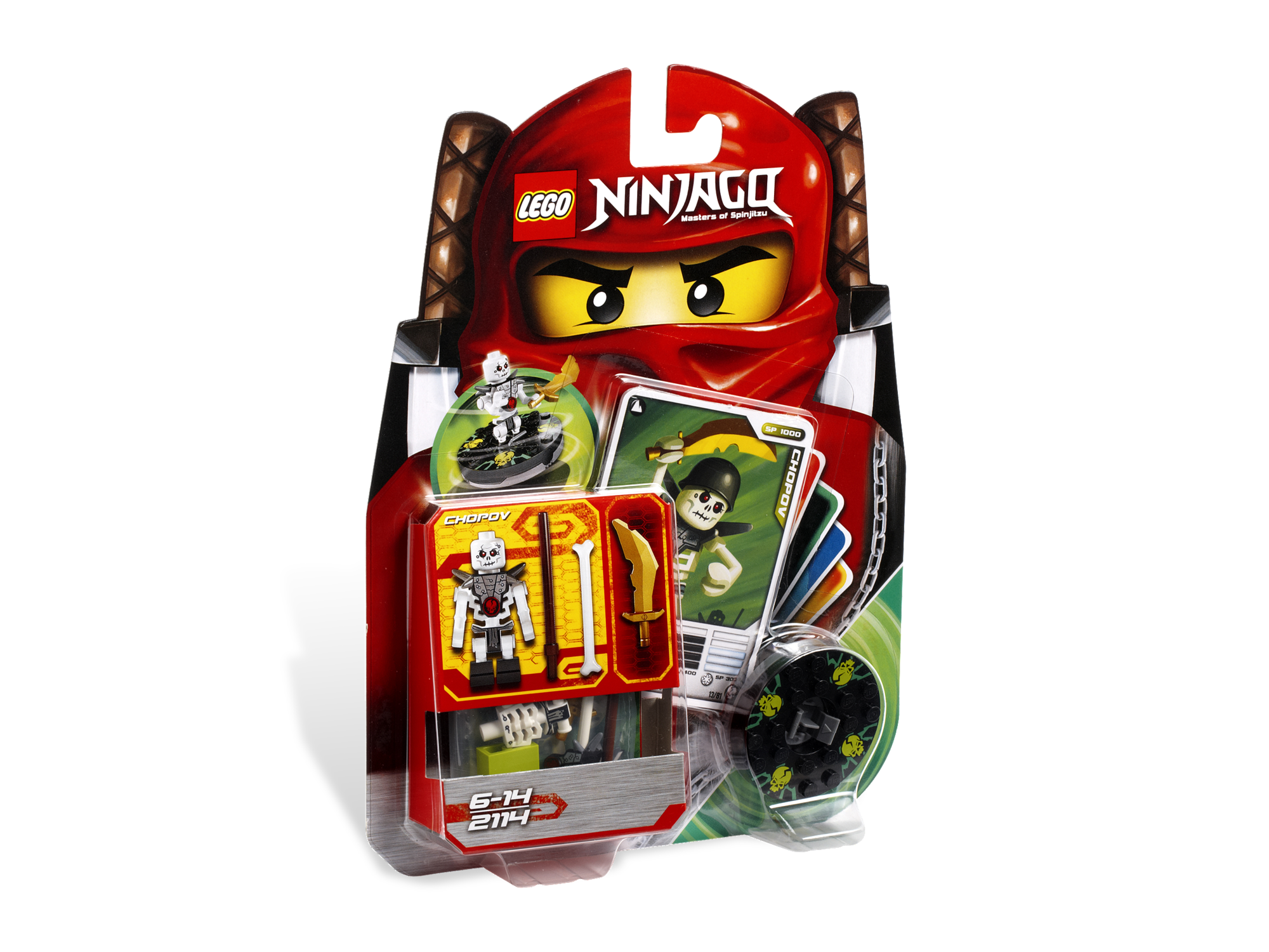 2114 Chopov is a Ninjago Spinners - pilot episodes set that was released on January 4, 2011. It includes Chopov, his spinner, his Nin-Jô, a Silver Bone, a Golden Dark Blade, his Character Card, four Battle Cards, and three lime bricks: 2 2x1s and 1 2x2 flat piece.