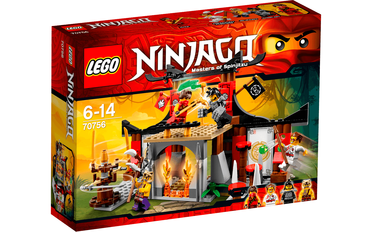 Join Kai for a thrilling Tournament of Elements showdown at the Dojo! Show speed and agility to dodge the dangerous spinning blade bot and climb the wall parkour-style. Grab the chain or take the steps to reach the top of the Dojo, but beware of the poison dart flick missiles. Battle against Griffin Turner and Karlof, evading Karlof’s huge crushing hands, and grab the Jade Blade. Just don’t fall through the trapdoor into the fire prison because there’s no way out! Includes 4 Minifigures with weapons: Kai, Sleven, Griffin Turner and Karlof.