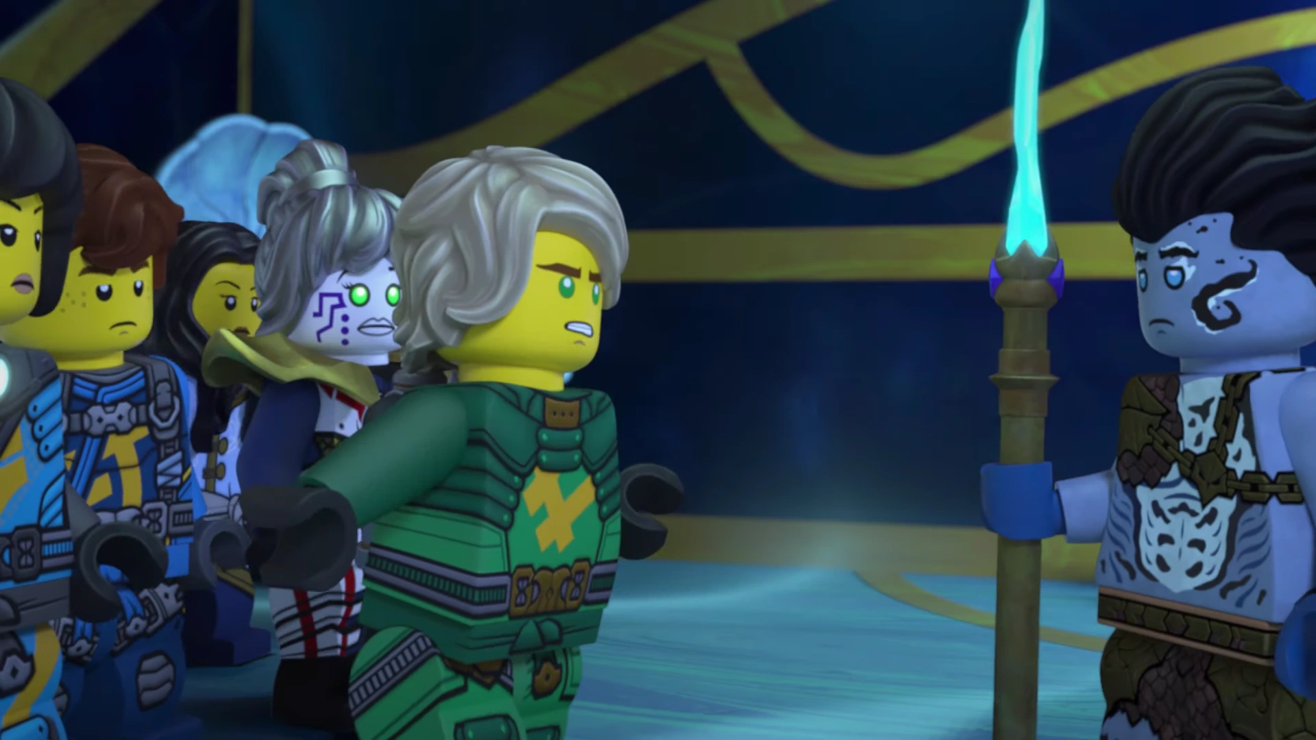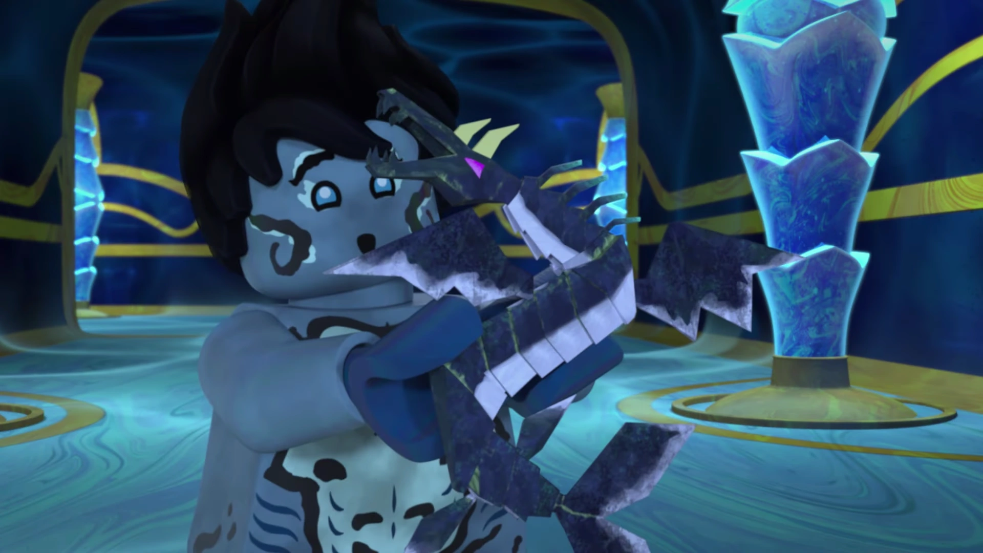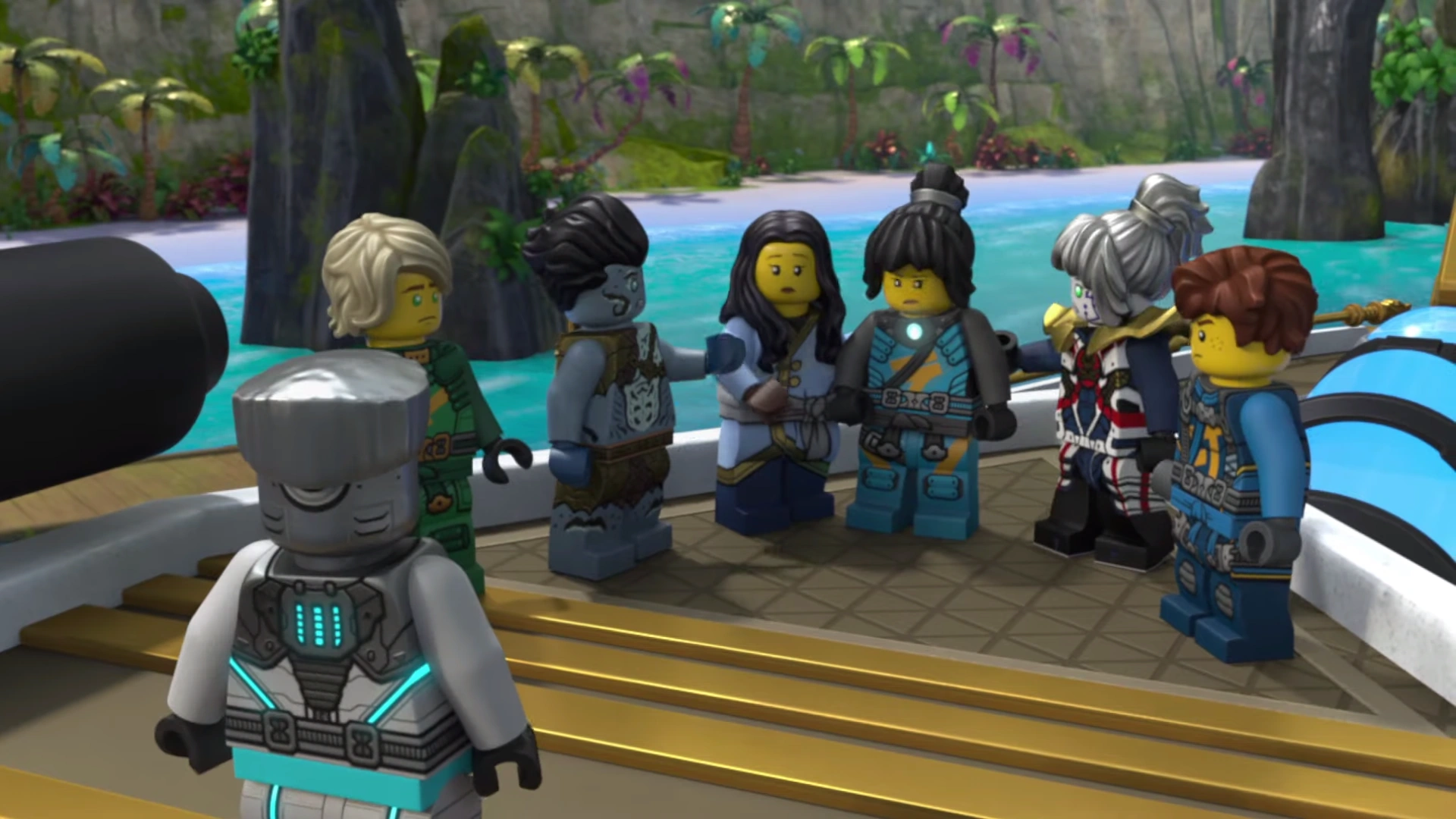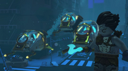 When they entered the hangar bay, they found a number of Maaray Guards. Benthomaar greeted them and explained that the ninja were his friends from out of town. Then Jay said he had an idea and approached the guards, even though Benthomaar wanted to stop him. When Jay thought his lie about coming from Bubbletubblepopolis was working and whispered it to Bentho, the guards attacked them. After a brief fight, when Kalmaar arrived in the hangar bay, the ninja and Bentho entered the Hydro Bounty and sailed out of the palace.