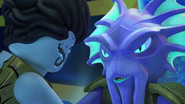 Later, when Nya finally defeated Wojira by destroying the Wave Amulet, everyone was happy, although Benthomaar realized that it was too late for her. As the ninja tried to save her at the roof of the police station, Benthomaar realized that the sea was calling her. When she left, he was saddened by her loss.