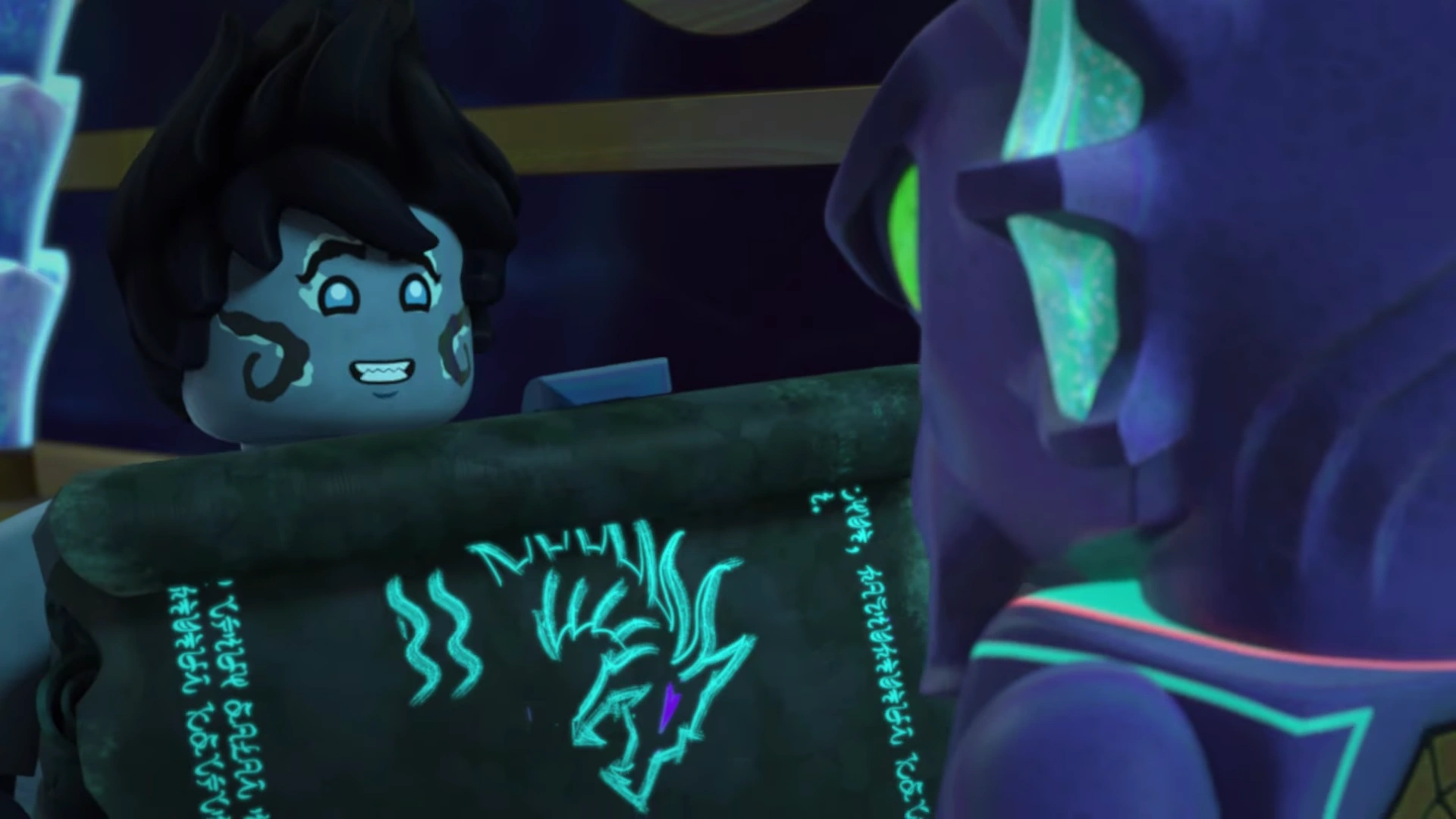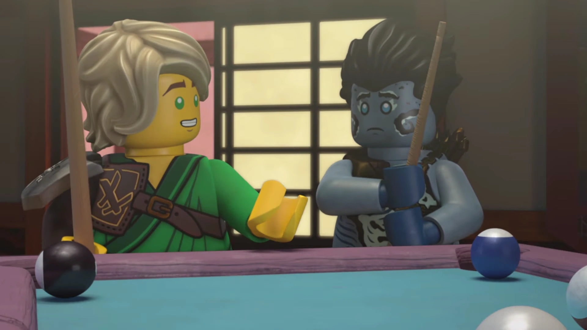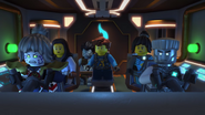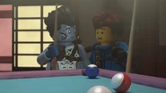 Benthomaar and Nya then returned to the relaxation room, where Lloyd, Zane, and Jay taught Bentho how to play billiards. During the game, Bentho asked them where the Storm Amulet was hidden so that his brother would not get it. Lloyd replied that they had "made some friends in high places."