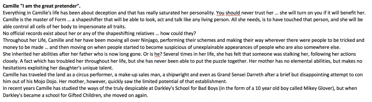 For many years, Chamille wasn’t involved in the Ninjas' adventures. According to Karlof during the Fall of Ninjago, Chamille became a "bad girl", though this is never explored. Sometime after, she accompanied Skylor in search of Skylor's mother.
