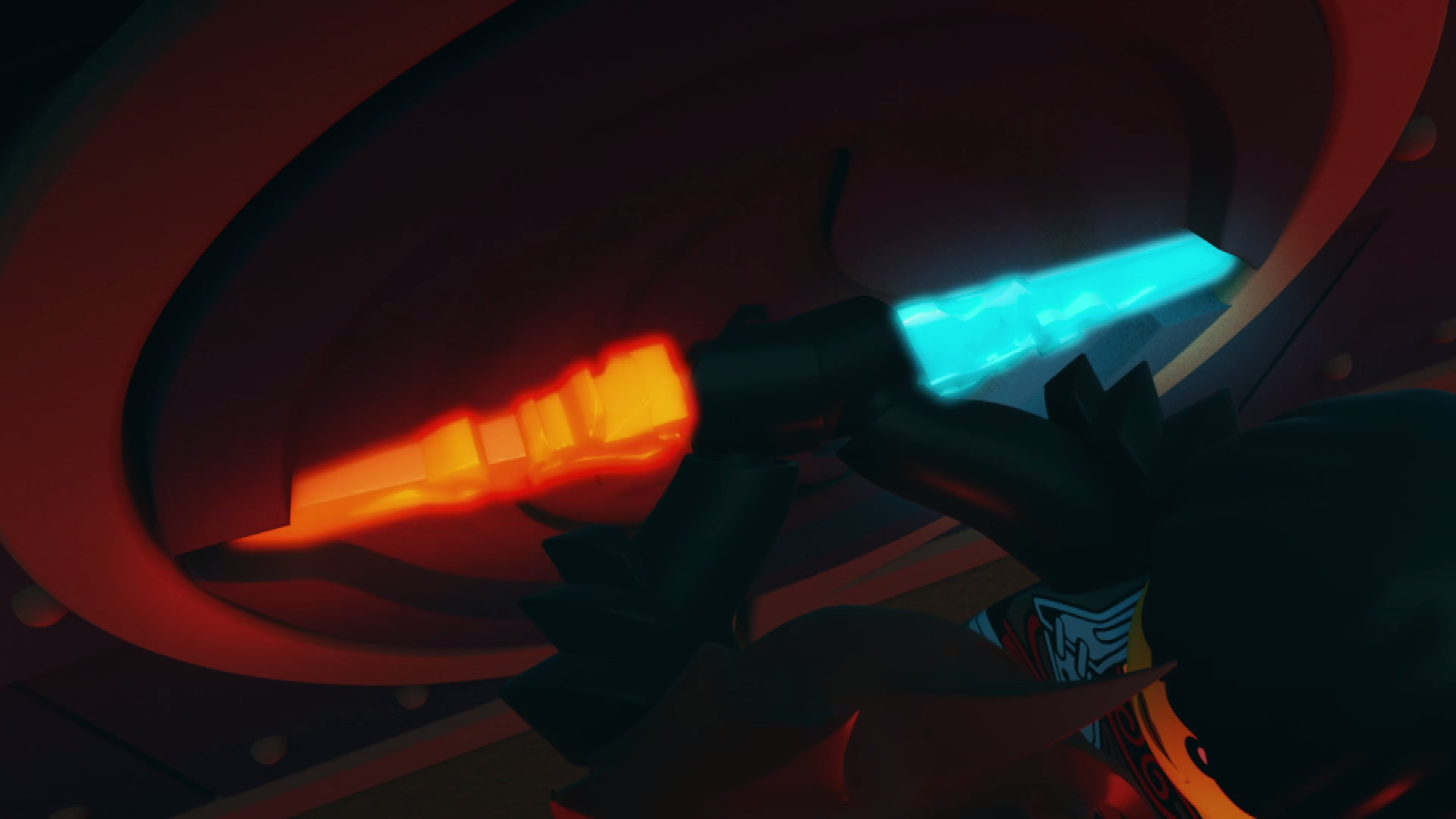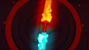 In the episodes, it is made of two dragon-shaped blades, with a golden connector joining them. The connector has two lines, blue and red respectively, indicating which side is for which element.