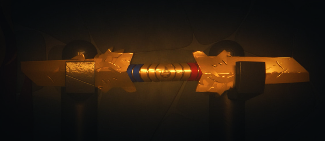 In the set, it consists of two blades, blue and red, joined by a golden connector.
