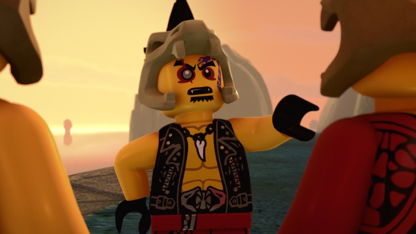 Taking control of a pair of decommissioned Condrai Crushers put on display, Eyezor and Zugu helped Chen ambush Kai and Nya at Ignacia, chasing the two as Eyezor pursued Nya. Ramming into Nya's Raider Bike, Eyezor attempted to topple her as he chased after the Master of Water. In the midst of the chase, Eyezor narrowly avoided the same fate as Zugu, who crash into a tree and was killed by the impact, coming after Kai and Nya on a more open plain.
