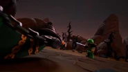 When they are approached by Daddy No Legs and Muzzle, the ninja tricked them and were able to tie them up. They stole their vehicles and continued driving toward the armor.
