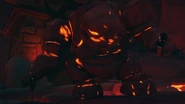 The Geotomic Rock Monsters are made of rock and have patches of lava across their bodies. They have a massive head and belly but small legs and arms.