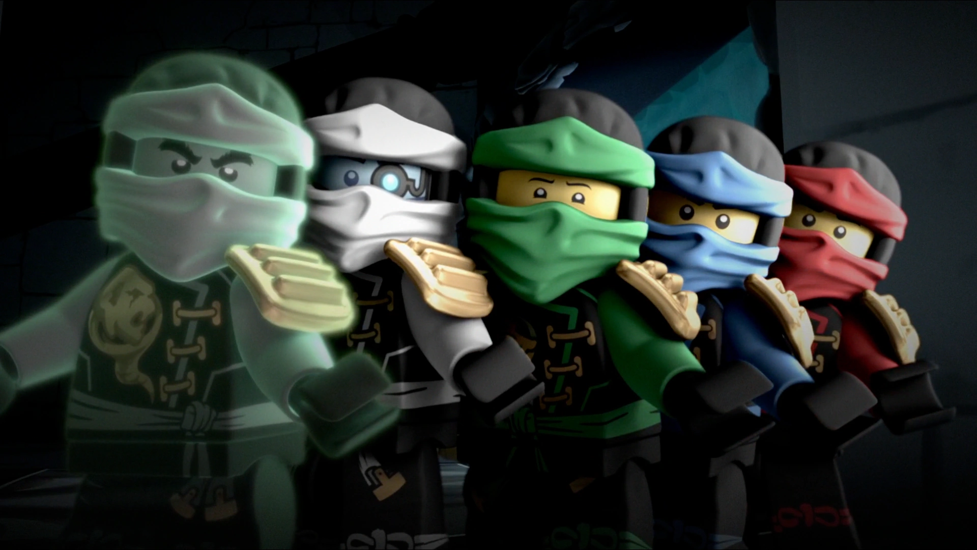 - The Green Ninja from Zane's dream in "Never Trust a Snake," with cutouts of the four original ninja from "The Surge," placed on the corners of the photo.