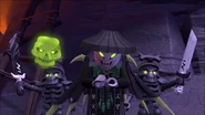 Ghosts can use magic for a variety of purposes like they can summon weapons like Ghost Blades or curse people into ghosts. They also have the ability to posses and transform ordinary objects into ghostly versions. For example, Ghoultar turned Nya's Samurai Mech into the monstrous Mech-enstein and Wrayth transformed a regular motorbike into the Chain Cycle, enhancing it with his powers such as flight and the ability to travel underground. Bansha demonstrated the power to communicate across dimensions and induce hypnotic trances—at one point briefly possessing Misako and using her to fight Master Wu. Arcturus demonstrated an ability to enlarge others and Yang was able to manipulate his haunted house. Ghosts are also shown to transform objects into ghostly natures. It is usually associated with green.