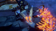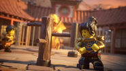 The fight took them out into the courtyard where Kai activated the training course to use to his advantage. Their fight was eventually stopped by Wu, and after the Master explained their objective, they all left in search of the first weapon.