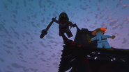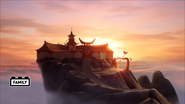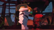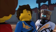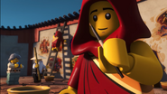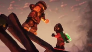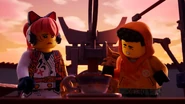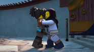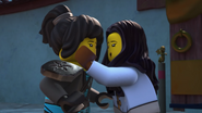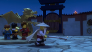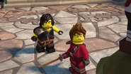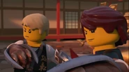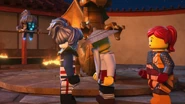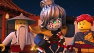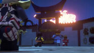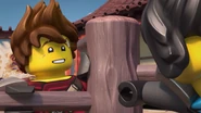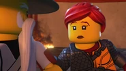 In the monastery, Jay practiced how to ask Nya to be his Yang on Kai. After Dareth and Nya walked in, she said Wu is observing the murals in the courtyard. When they went to visit him, they saw Firstbourne crash on the side of the mountain with Faith in her claw. They carried the latter inside the monastery to have her heal.