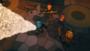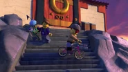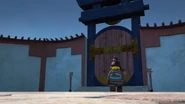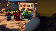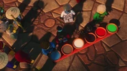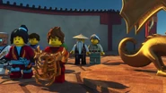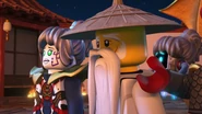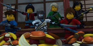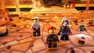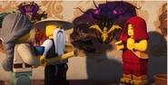 Inside the monastery, the ninja are seen playing video games before using the Bell of Divinity as a hot tub. This causes an angry Wu to demand an emergency meeting back at the monastery.