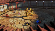 Originally, there was an even smaller statue by the door, which when opened, revealed a red button that activated the training course. When pressed, the golden statue protruded in the middle, revealing many mechanics for training ninja. During the renovation of the monastery, this function was probably removed. When Lloyd started to train Arin and Sora, one of the tiles of the courtyard was a button for the training course.