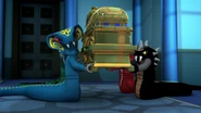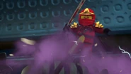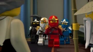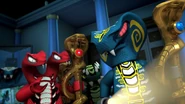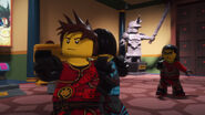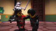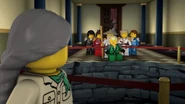 The ninja then got to the correct Hall in time. Lloyd grabbed the scroll, but it corrupted him and Nya hits it out of his hands towards the entrance. The snakes enter the hall and they fight for the scroll.
