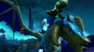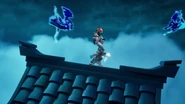The sequence is basically the same, except the location is replaced with the Spectral Lands, The Ninja are in their spectral suits. The Ninja with Lloyd leading them, jump along the rooftops of the Spectral Lands with Wyldfyre flying on Riyu as they head for Thunderfang's ghost and narrowly missing a lightning strike before the classic ninja put their masks and hoods on and pass by the Arc Dragon of Focus while heading for Thunderfang and the Forbidden Five. On one rooftop, Zane fires Ice at a Spectral Dragonian Warrior while Sora kicks a Spectral Dragonian Scout away and lands behind Zane and they pose. Kai and Nya jump high, weapons at the ready as they face Kur and Zarkt. From the ground below, Arin, holding a Prismatic Blade, and Ras watch Wyldfyre face a Spectral Dragonian Warrior before Arin turns to Ras. Thunderfang roars as Riyu flies towards him and Wyldfyre jumps off, fist raised before suddenly changing to Kai, then to Nya, then to Cole, then to Frak, then to Sora, then to Lloyd, and finally Zane as he charges at the screen with a punch. The Ninjago: Dragons Rising logo soon appears with the Dragons Rising part in red, then sparks appear around it, turning the title purple and then transitions as the sparks turn into one of Thunderfang's tornados.