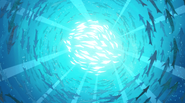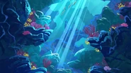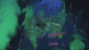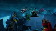 At the beginning, a shot appears from the bottom of the sea upwards, where fish swim in a circle. Clips from previous episodes appear in the middle. This is followed by a cut to the seabed full of blue stones with corals and other colorful sea animals and plants. From above, several rays of light penetrate to the bottom, in which a few fish swim. A clip appears at the bottom. The scene gradually scrolls down until it is covered by bubbles. When they disappear, the graveyard of ships appears, where there is almost no light and shipwrecks are visible. Another clip appears in the middle. The scene moves down again showing a large steamer and is again covered with bubbles. The following image shows a number of sharp black rocks in th Tartarus Trench. In the middle is another clip, through which two pink eels swim. A green mist approaches the sides, covering the screen and revealing the inscription Ninjago on the full bottom of the ocean. The inscription is made of water that glows. When the inscription explodes and crumbles to water, a title card appears.
