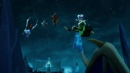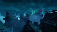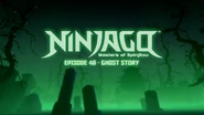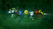 At first, a few Skreemers circle on a black screen until a graveyard with green mist appears near the Temple of Airjitzu and is noticed by Kai with a fire in his hand and frightened. When he defends himself against the Skreemers, the shot stops and for a moment it shows him in a cartoon's appearance along with his name, which is is simalar to the Rift of Return from "Day of the Departed," as is the case with everyone else. Then he shots a fire in front of him. When he disappears, Nya appears there, frightened with a flashlight, exploring the area. A Skreemer steals the flashlight and then throws it back. Then she lights a flashlight and her name appears. The scene moves to Jay, who is trying to create lightning, but when he is attacked by Skreemers, he stops and gets scared while his name appears. The scene moves to Master Wu, who is holding a lantern. The Skreemers fly past him and he looks at them as his name appears. This is followed by a shot of Zane, whose body a Skreemer flies through. Zane then settles down and his name appears. Skreemers again fly on Cole, who tries to defend them while his name is shown. The scene moves to Lloyd, who fears a Skreemer until his name is revealed. Then he grabs his head. Then a group shot of everyone next to each other appears, with a confused Lloyd in the middle. He then remembers and puts on a mask. This is followed by a shot of his eyes with a strange green light. The following is a shot of the graveyard with Creation Spinjitzu, which will show the title card. The Ninjago logo is glowing green and moves in a ghostly fashion for added effect.
