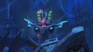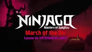 The Previously on Ninjago shot is Garmadon. The title card consisted of a black silhouette of the Dead's End on an orange background and a large black strip across.