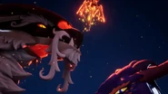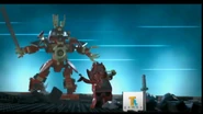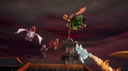 The sequence starts off with the stranded ninja running away from the Dragon Hunters, and the shot pans into dragons, transitioning into Ninjago City, overtaken by the Sons of Garmadon. First the Colossus is seen, then Lloyd and Nya hiding, then Chopper Maroon and Mohawk, then Ultra Violet (with the Oni Mask of Vengeance), Harumi and Killow (with the Oni Mask of Deception). Harumi takes off the Oni Mask of Hatred, transitioning into some chains. The marooned ninja are holding their weapons and running forward while Nya and Lloyd are running away. They both stop as a massive Garmadon comes into the shot, breaking through the chain and transitioning into the title card.