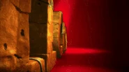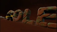At the beginning, a large stone door with a Shintaro Mountain lava outline opens, followed by a rail truck launch, with a clip from the previous episodes appearing on the stone wall with the Dire Bats, then another clip appearing in green crystal and then blue, followed by a clip on gold shield of the skeleton hanging on the wall of the tunnel with the giant spiders. Subsequently, a stone wall appears, which has cracks through which to see lava.