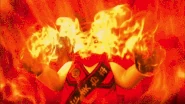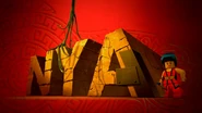 At the beginning, a fire appears, which reveals Kai with another Fire in his hands as he stands on a rock against a red background. The scene then zooms out, revealing that he is standing on his large stone name with vines, right on the letter 'K'. The scene moves to Cole's stone name captured by the vines. Cole then jumps to the name and stands in the middle of the letter 'O', where his hand glows green and black, using the Earth. Through the letter 'O', the scene moves to Jay, who first jumps to the letter 'J' and then jumps down between 'A' and 'Y' and creates Lightning. Subsequently, a side shot of Lloyd's name is shown along with his exploration of the environment. Then he creates a ball of Energy and throws it into the screen. The scene turns several times and shows Zane's name when a dagger lands on it, which adds paper with Zane's picture to the stone seen in "The Invitation." A spark will appear and then Nya, who has a welding helmet on and uses a welder to attach metal to the 'A' on her stone name. Then the scene moves to Wu and Garmadon, who perform the same movements. The image zoomed out, showing their names, Garmadon horizontally and Wu much larger vertically above and below the letters 'GAR'. Then a group shot is shown, where everyone creates Spinjitzu and throws a picture with Zane. Then they cover the screen and the title card appears.