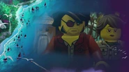 At the beginning, the coast of the Island of the Keepers appears with visible jungle, beach and rocky outcrops in the water. Seagulls and a ninja's catamaran are also visible. The water is clear blue near the shore, but the further it gets, the darker it is. A clip from previous episodes appears in the darkest part. Subsequently, the closed eye of a Stone Golem appears, covered with leaves, which, however, turns into another clip when opened. Subsequently, a waterfall with rocks and palm trees appears, together with Twitchy Tim standing on a large rock and watching another clip in the water of the waterfall. Subsequently, the yellow eyes of the Stone Golem appear in the multicolored leaves. When lightning strikes, another clip appears in the sky and the island itself with a catamaran on the coast.