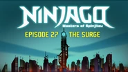 At the beginning, a blue radar appears on which the four original ninja walk towards each other in the middle. When they get there, the inscription NINJAGO appears in front of the radar, which the ninja then skip. They drag long graphs of their colors as they run across the dark blue background with the numbers moving vertically down. The scene then rotates to show the ninja running up until they change into their names at the ends of the graphs. The names move down where they stay, and the Overlord's eyes appear on a dark green background, along with a crowd of Nindroid Army walking under his eyes. Lloyd runs up to them in front of them, pulling a graph of teal color behind him and starts fighting the nindroids. Then the scene stops, zooms in and shows his name. The scene is covered by a straw hat, which reveals Sensei Wu. Then he disappears and his name appears. Subsequently, Garmadon appears showing off the moves, when he suddenly turns into pixels and his name appears. Then Nya appears sitting at a desk with a computer, along with her red name in the background. She stretches her hand up and will show all the ninja graphs that are moving up. When they break, the ninja in their Techno outfits (save for "The Surge," where they appear in their Kimono outfits), Nya, and their masters fly out of them and remain standing in the air. Then they disappear and the title card appears.