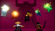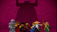 At the beginning, a fire appears, which when it disappears, reveals Kai on a dark red background with the Sword of Fire in his hand, while two fires burn next to it. Then he does Spinjitzu and he shows up without a mask with his name next to him. Then a blue background appears, where Jay jumps and extinguishes Kai's fires with the Nunchucks of Lightning in hand. He does Spinjitzu and shows his name as well as Kai before and everyone after. On a white background, Zane then makes a slide with the Shurikens of Ice. Against a dark gray background, Cole then strikes the Scythe of Quakes and makes a hole in the ground. Then it shows Wu turning while his name is in front of him on a white background. Then Nya appears on a blue background next to her name.