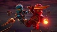 The sequence is basically the same, except the background is replaced with the City of Temples, Jordana and Nokt replace two of the wolf warriors, Cole and his mech replace Kai's, Wyldfyre is on Riyu, the inclusion of Zane, Lloyd stops to perform Spinjitzu and then the Rising Dragon technique, passing over the Source Dragon of Motion. Each fighter soon splits up with Riyu knocking a wolf warrior down, Nya disarming Jordana, Sora kicking one down before backflipping, and Zane using Spinjitzu before jumping to avoid Ras' hammer and then kicks down Cinder, all the while, the screen heads for Nokt, who prepares to do Shatterspin before Lloyd flies down towards him, creating a flash which engulfs the screen. The Ninjago: Dragons Rising logo then appears then get shot at by fire strikes then transitions into the episode.