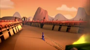There is an empty sandy space a few foots around the arena and there are also eight trapezoidal orange-yellow buildings arranged in an octagonal shape. Behind each of these buildings there is another, slightly larger, and one behind them, which is, however, partially submerged in sand. Cylindrical turrets are built at the corners of each building. There are low railings on the roof of each building and they can be walked on as they are horizontal. In each of these buildings there are several apartments that used to be inhabited by Serpentine.