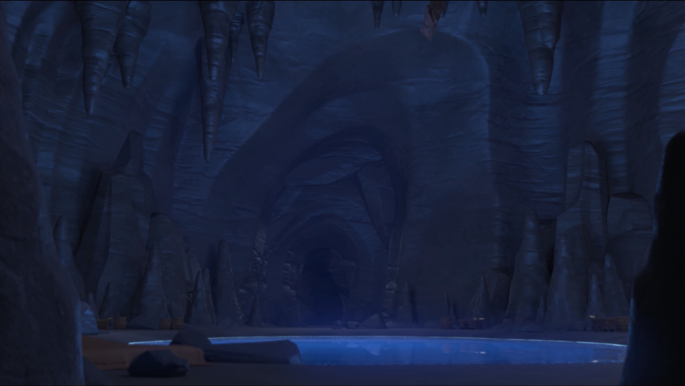 Cole concentrates and his hands begin to glow. Suddenly, the immense rocks start to float and Cole uses a robust Earth Punch to discover a hidden cave underwater. Everyone follows Cole's lead as they swim inside the cave and leave Rock-Bottom.