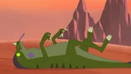 After seeing the injured reptile, Korgran's father explained to Korgran that Ross is his division manager. Korgran's father apologized to Ross and helped him walk outside. Ross then blew a raspberry at Korgran as he left.