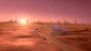 The Sea of Sand was once part of the Endless Sea. The Destiny's Bounty ran aground here,[2] remaining almost completely intact even as the water around it disappeared and the land became a desert, pushed upwards due to tectonic shifts,[3] allowing the Falcon to lead Zane to the ship as a new home for the ninja.[4]