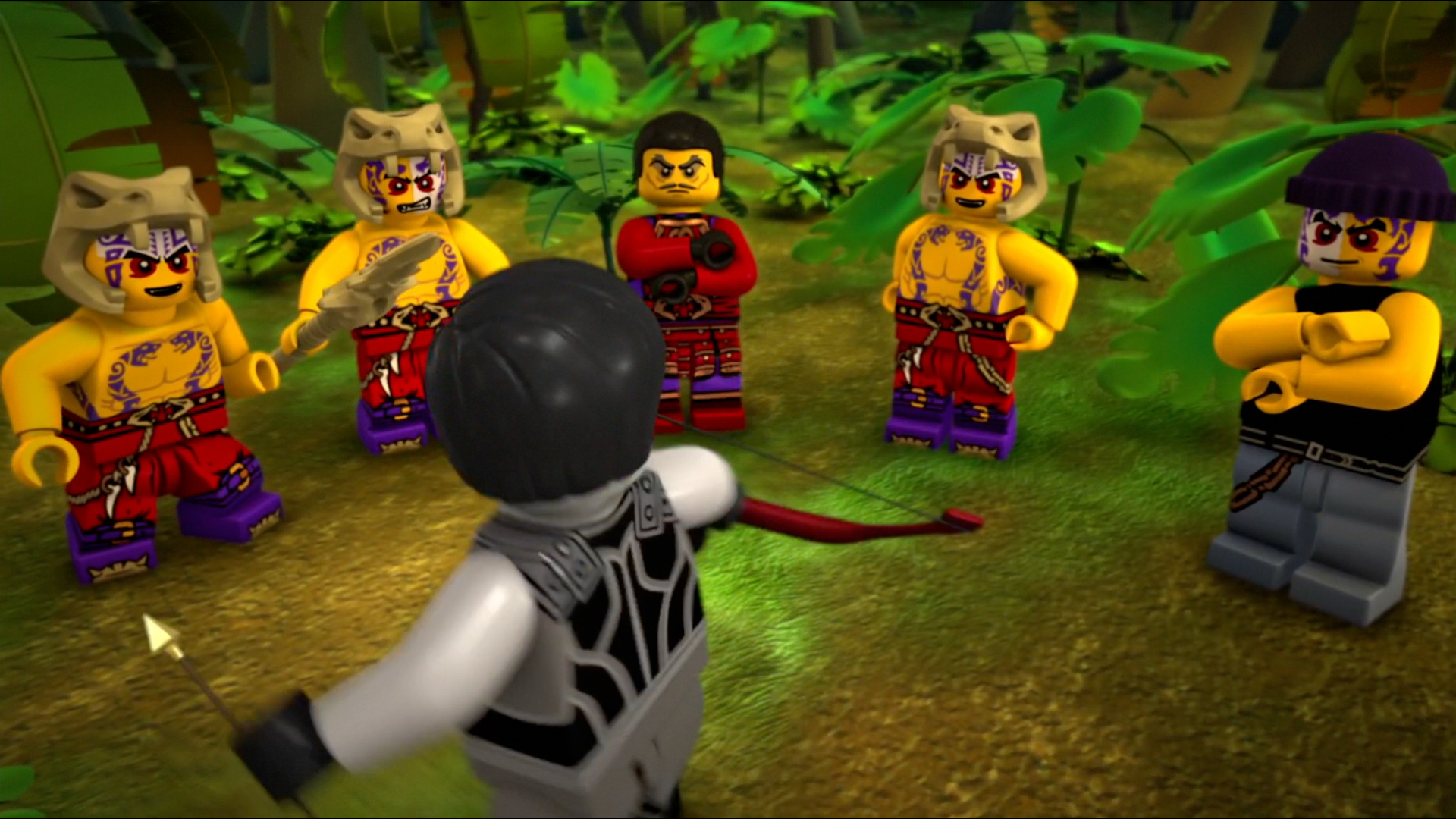 A little time later Shade landed safely. Once he was on the ground, he started to look for Nya and soon found a bow and arrow left in the forest by Chen as a gift to help in the search. However, the bow was embedded with a tracking device.