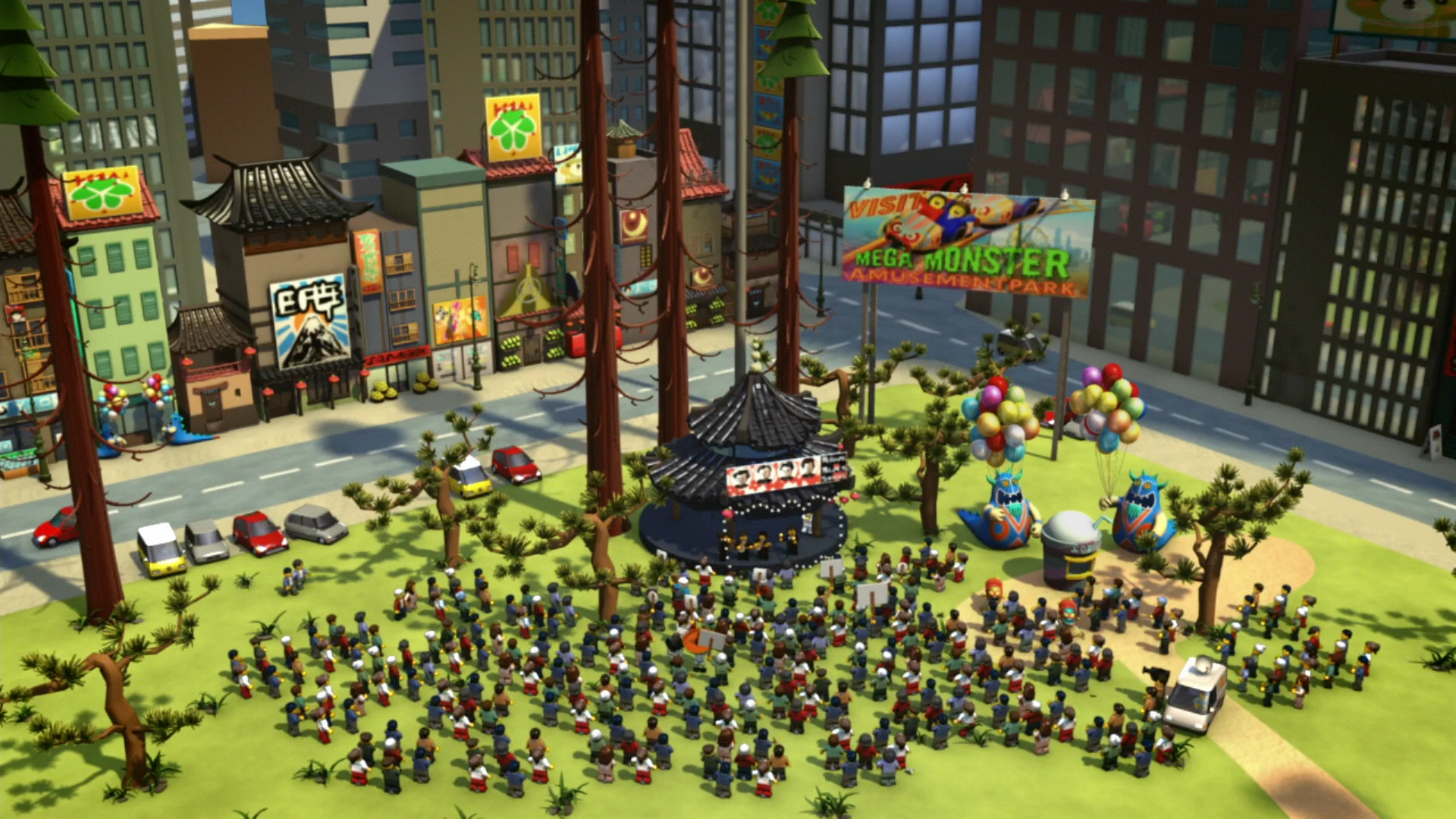 The Take Back Ninjago rally was held inside a park in the center of Ninjago City. The event was covered by NGTV and featured a performance by The Royal Blacksmiths. Rally attendees had gathered to raise awareness of and to take a stand against the Serpentine, with some carrying anti-snake signs, while chanting "We want snakes to slither away!" The rally however, would be disrupted by the sudden appearance of the Great Devourer, immediately causing all participants to disperse as they fled from the massive snake.