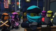 Managing to grab Lloyd, the Teal Ninja hears Kai call out to Zane by his real name before unmasking Lloyd, surprising the New Ninja before they manage to escape with the staff. While the New Ninja tended to the drivers, the Teal Ninja informed the mayor about the old ninja having been the ones responsible before the mayor demands their capture, proclaiming them public enemies.