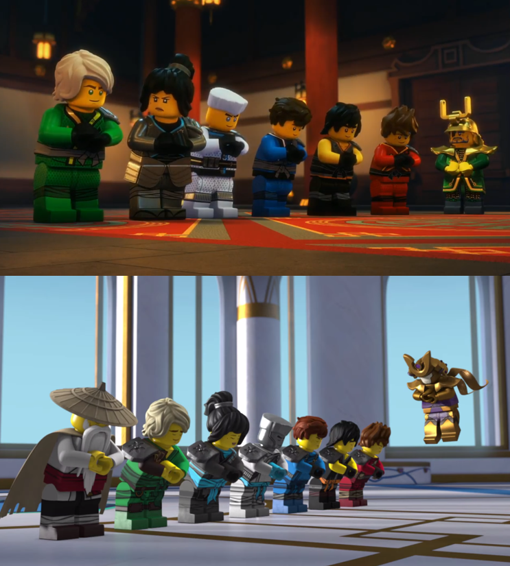 The ninja's lineup when bowing to the Emperor and Empress would later be replicated in "Into the Dark," with the ninja positioned in the exact same spots when bowing to Vangelis (with the addition of Wu added to the far left of the lineup).