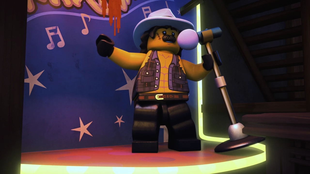 At Laughy's, Ultra Violet and Mr. E arrive. Zane, hiding behind a newspaper, tells Cole (who is hiding in a dumpster), that "two high-ranking Sons of Garmadon just arrived." Cole leaves the dumpster, only to reveal he is disguised in a white fedora with a fake mustache. Cole offers Zane a tin trash lid and a can of shaving cream for a disguise, but Zane simply "transforms" into a Son of Garmadon-esque disguise. Cole dubs him "Snake Jaguar." The ninja then struts into the bar. Two men are singing, but not very well. One Son of Garmadon asks the barkeep for another drink. The ninja walk up and recognize him, leading to Zane saying "Dareth? What are you doing here?" Dareth turns around and recognizes Cole. Dareth explains that he bought the place as a way to get closer to when he fought side-by-side with the ninja, but the Sons of Garmadon have moved in and he can't get them to leave. Cole explains why they are there to Dareth, and Dareth says that it's impossible. Ultra Violet has the two singers thrown out and everyone cheers. Dareth tells them about Mr. E and Zane responds in confusion. Dareth is called away by a member and Zane formulates a plan. Cole doesn't like it, but when Zane tells him to sing, he does. He gets up on the stage and everyone turns to watch. He says "Song number 159, pronto" as he tosses a coin to Zane, who puts it in a jukebox. Zane chose the wrong song, however. Instead of Creeping Death, Cole got a song called Glow Worm. When Cole starts singing, the Sons all start to laugh, as he isn't very good.