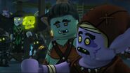 The ninja continue to remain bound in shackles that seem to be Vengestone as they are interrogated by the Dragon Hunters before being dragged through Dead's End to the Pit. While being dragged to the Pit, they saw a Fire Dragon chained in Vengestone and was being forced to create armor and weapons for the Dragon Hunters.