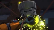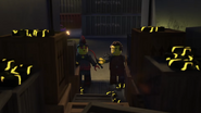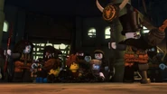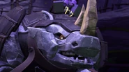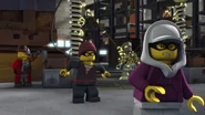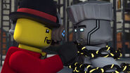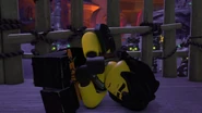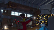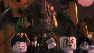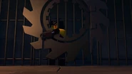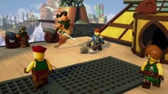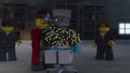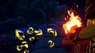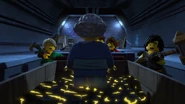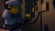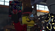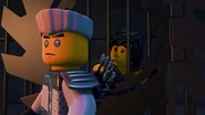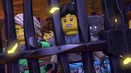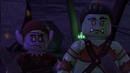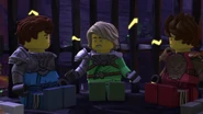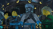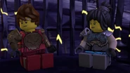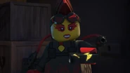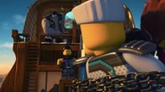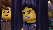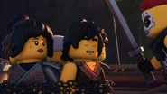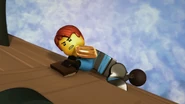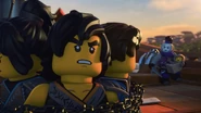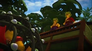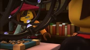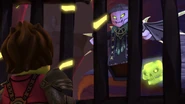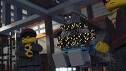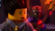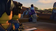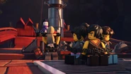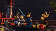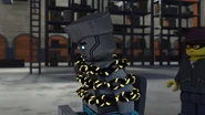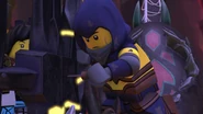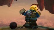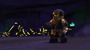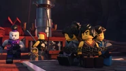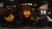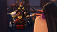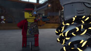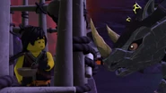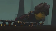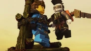 As the ninja continue fight the Colossus, using Vengestone Chains to try and incapacitate it. However, the chains are ineffective, and they eventually run out of them. Kai jumps onto the Colossus and begins binding the chains together even tighter.