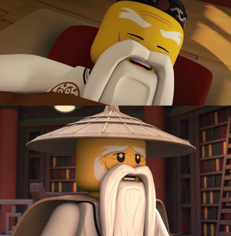 Although in pilot episodes or Season 1 he said he was old, indicated that he was weak, and had a horse carriage or he could ride with Nya the Samurai Mech, in later seasons he did not like being called old, for example, in Season 5, when Nya called him old, he said it didn't mean he is weak. In Season 11, the ninja also call him old, to which he will be told that they are simply afraid of him. His character also changed, as he was a little more eccentric in the first seasons, for example when he danced with the ninja in pilot episodes or he ate cotton candy or was amazed by a ferris wheel at Mega Monster Amusement Park. He also laughed a lot more and had fun with the ninja. He almost always had his hand behind his back when walking and was slightly hunched over.